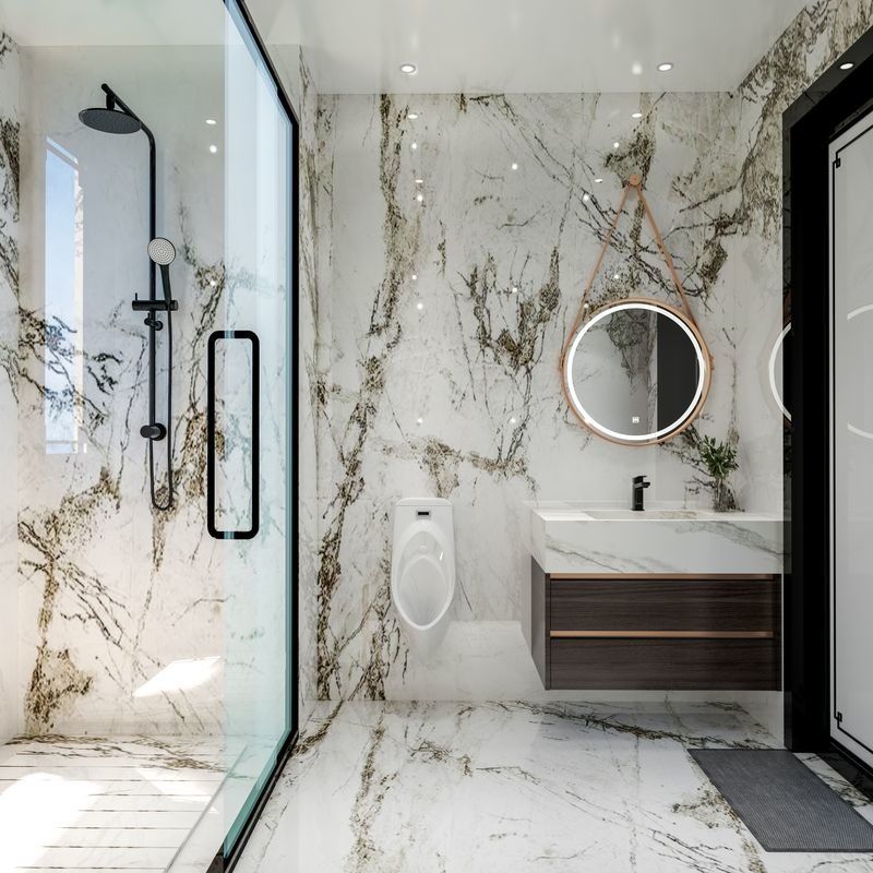 | Πάνελ Τοίχου και Δαπέδου | Μάρμαρο με λευκές και μαύρες φλέβες, ενισχύοντας τη συνολική αισθητική με μια πινελιά πολυτέλειας |