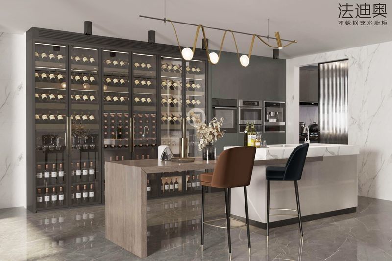 | Σχεδιασμός διάταξης | Ενα ντουλάπι κρασιού από το πάτωμα μέχρι την οροφή με ενσωματωμένη συσκευή και ένα εκτεταμένο νησί για καθίσματα και αποθήκευση. |