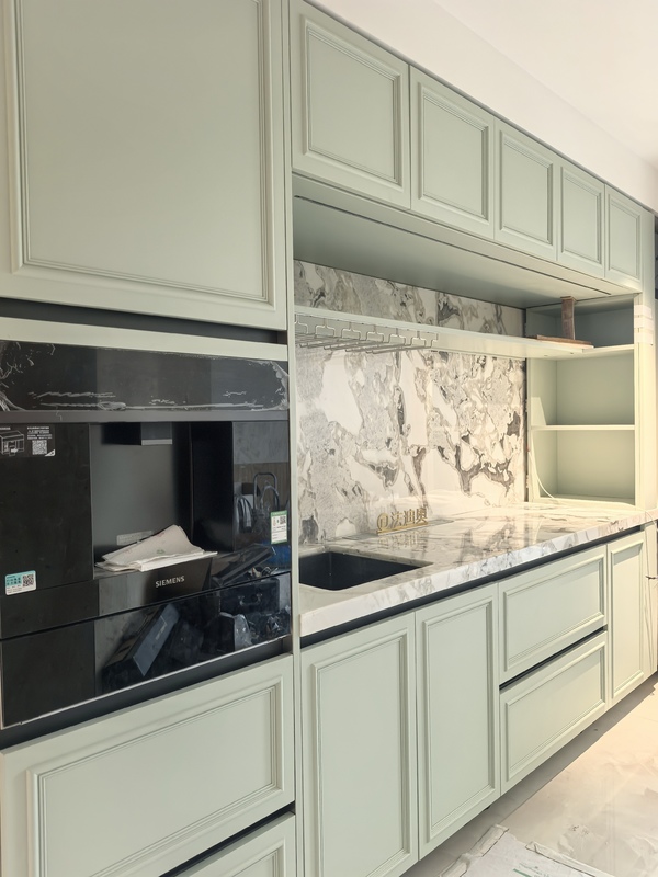 Αυτό το ντουλάπι της κουζίνας παρουσιάζεται ως ένα σύστημα που καθοδηγείται από το σχεδιασμό και όχι ως ένα γενικό SKU.Χρησιμοποιεί το μπεζ / πράσινο μαζί με τη δομή του ντουλαπιού από ανοξείδωτο χάλυβα για να δημιουργήσει μια πιο αποφασιστική οπτική ταυτότητα για προνομιακά οικιστικά έργα.