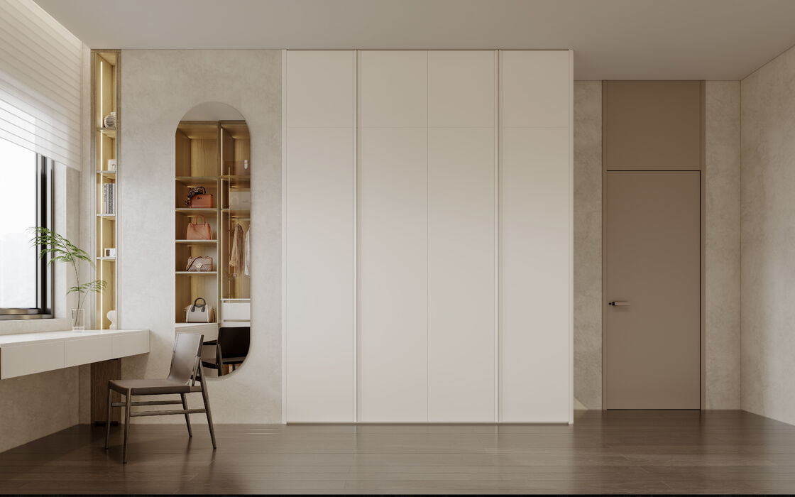 Σύγχρονος μινιμαλιστικός σχεδιασμός ντουλάπας που συνδυάζει καθαρές αρχιτεκτονικές γραμμές με ζεστές υφές υλικών και απαλούς ουδέτερους χρωματικούς τόνους. |