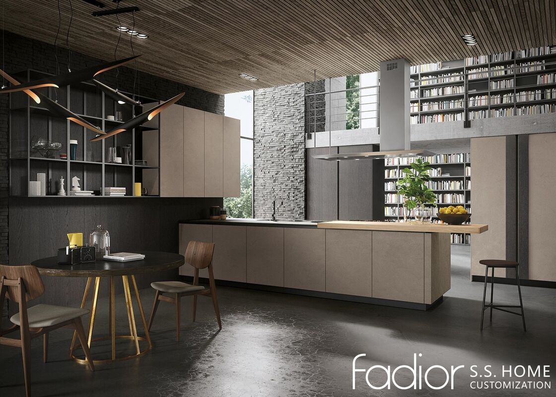 | Χρωματική παλέτα | Οι επιφάνειες των ντουλαπιών σε τόνο πέτρας συνδυάζονται με σκούρα ράφια και θερμές υφές ξύλινης οροφής. |