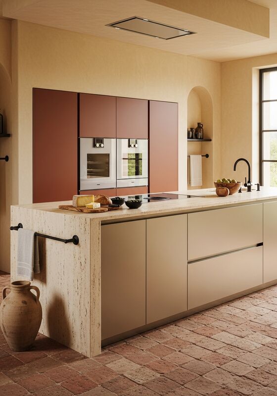 | Material & Performance304 food-grade stainless steel with PVD champagne-gold coating; matte terracotta-tone lacquer on select fronts; natural honed travertine countertop; dark iron black metal accents supports moisture resistance, finish stability, and long-term daily use in premium residential kitchens seeking warmth-driven luxury; villas and homes with mediterranean or spanish colonial architecture; designer projects requiring statement island presence. That matters when buyers need architectural appearance without wood-based maintenance risk. |