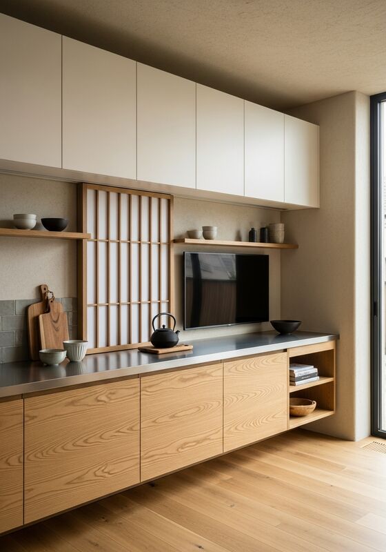 Συγκρατημένος μινιμαλισμός Japandi με ζεστασιά υλικού wabi-sabi — κυριαρχία σε ίσιο κόκκο δρυός, ζεσ |