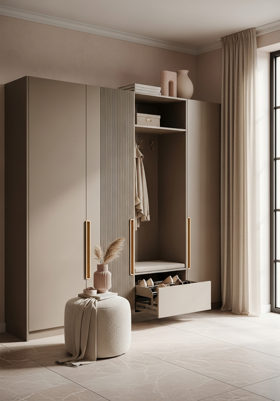 | Design HighlightsSoft feminine minimalism with architectural fluting detail, zero-sheen silk-touch surface, warm tonal palette direction with warm mushroom taupe dominant; pale champagne drapery-compatible tones; champagne gold metal accents, disciplined proportions, and vertical micro-fluted wardrobe doors at 15mm pitch in warm mushroom taupe lacquer. The page should read as a resolved specification, not a generic storage box. |